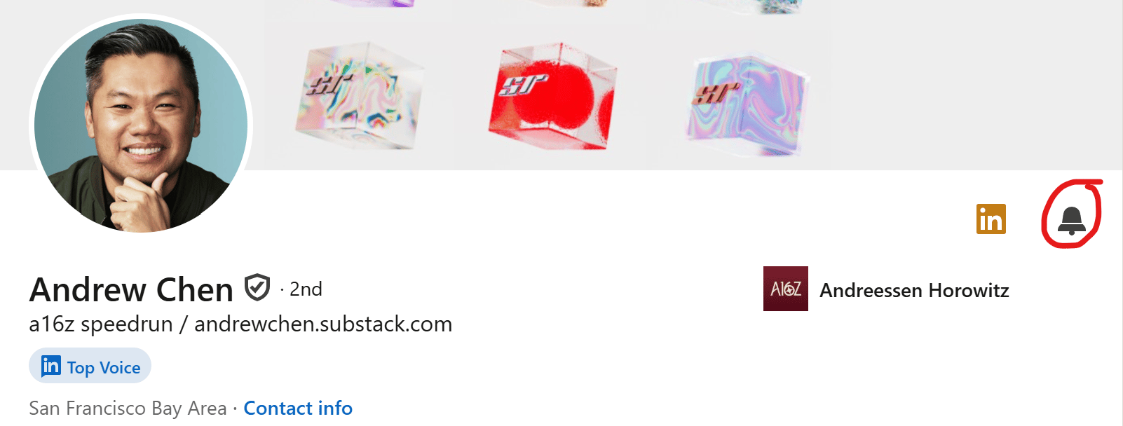 Early comments get the most visibility. You want to show up when they post, not 12 hours later. Use the bell icon in the top right corner of a person’s profile to do this.