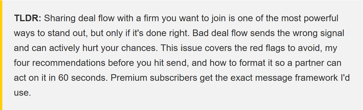 There are many ways to stand out. You have to find the path that feels most authentic to you. Deal flow sharing is one move in a longer game. It works best when you've already been building a relationship with someone at the firm, or when you've made yourself visible through your content, your network, or your outreach over time.