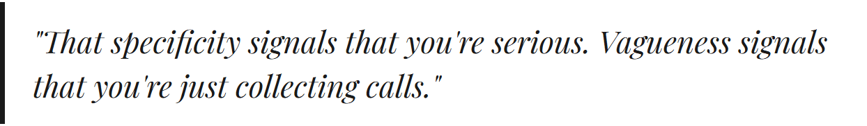 I understand why people do this. You need a job. You're working toward a goal. But the mindset of "I need to get in front of as many VCs as possible" is the exact wrong approach, and experienced investors can feel it immediately.